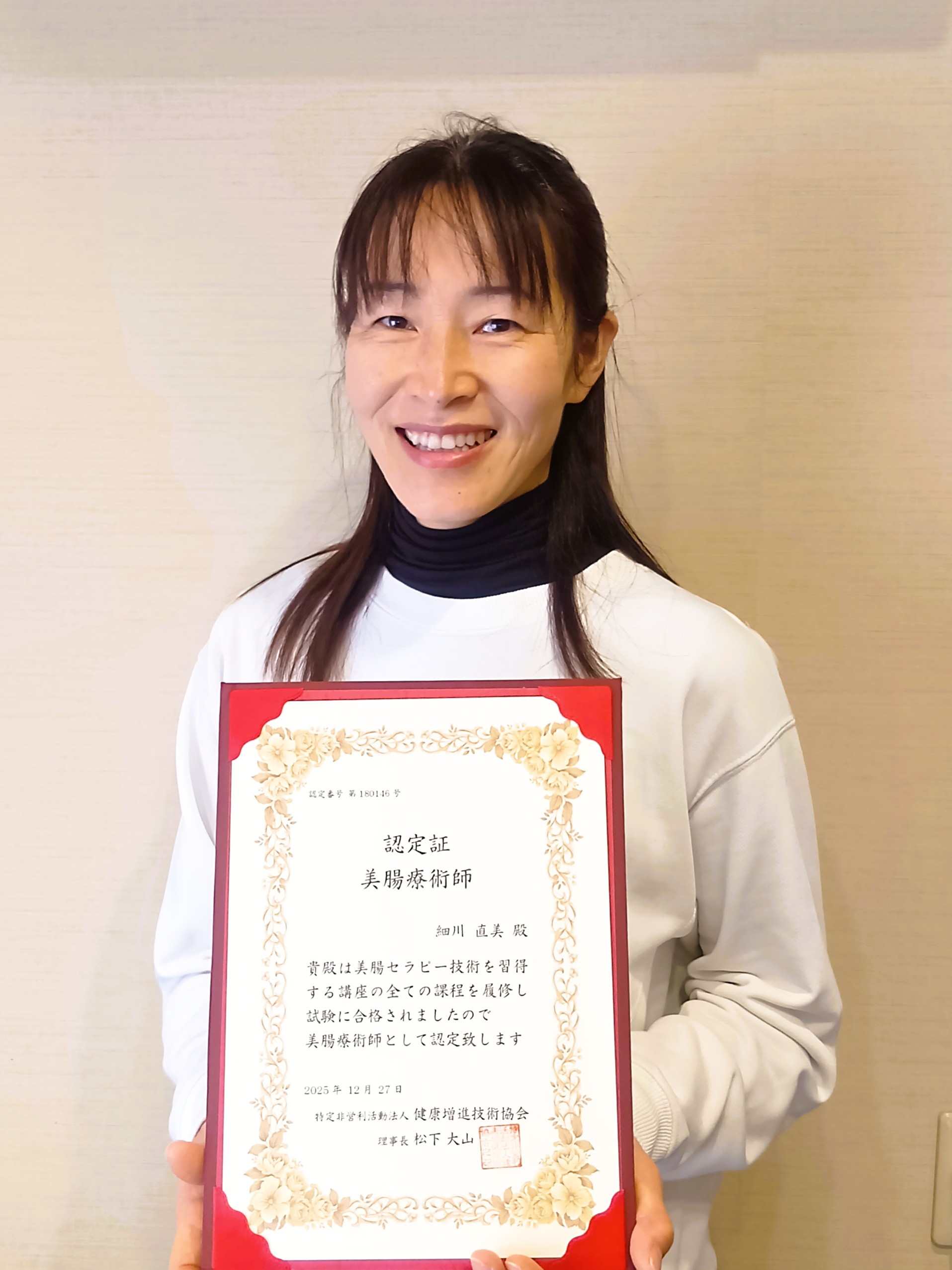 この度、座学は松下先生、技術はTA西浦さんからご指導頂き、美腸療術師・資格講座を受けて、無事に卒業致しました。妊婦期間に学科を受け、松下先生には身体を気遣って頂きながら楽しく勉強…
